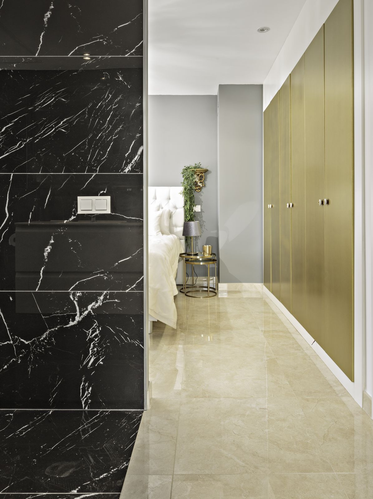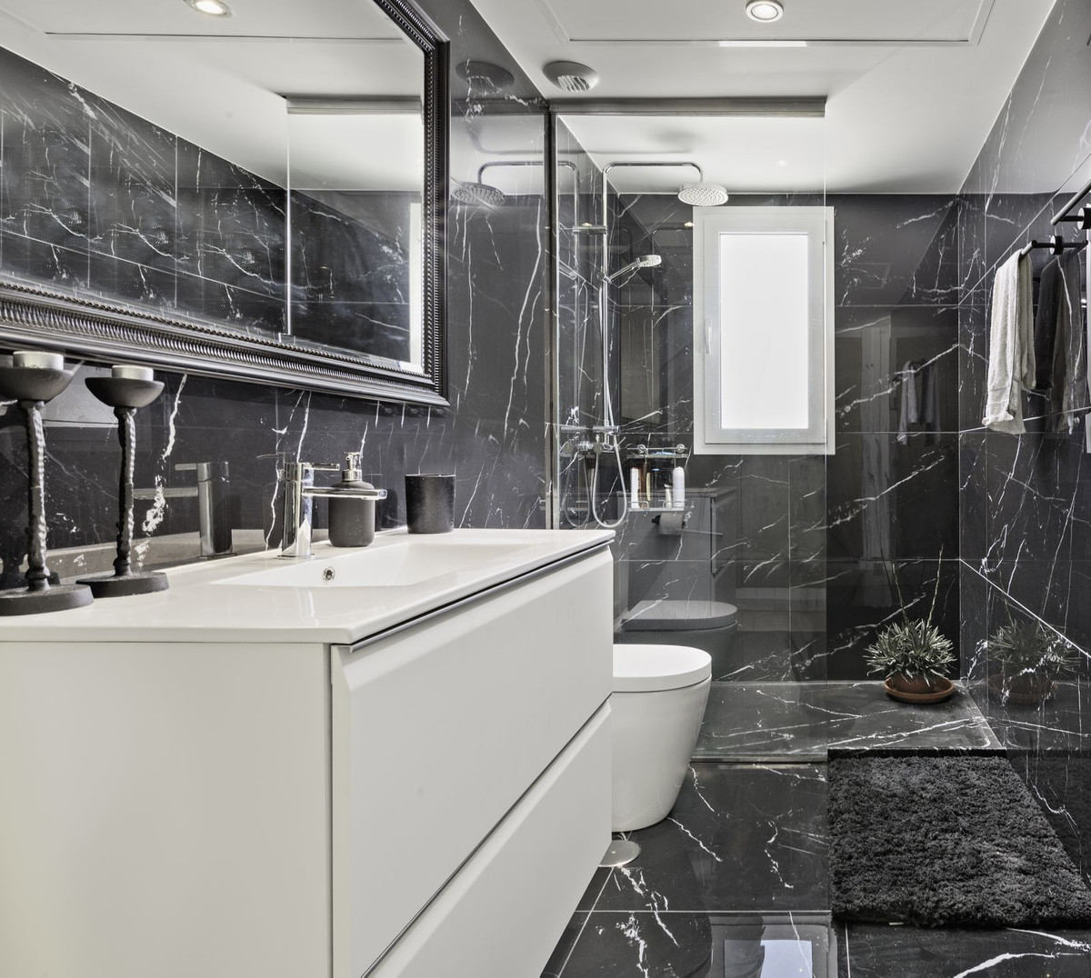 A sophisticated, modern stairway with a large window leads us upstairs to the master bedroom and a solarium. The master suite comes with ample built-in closets. The ensuite bathroom is done in black slabs with white veining, which, juxtaposed with the white sink and cabinetry, makes it simply stunning!! The solarium is ideal for sunbathing, as it is entirely private, with a high table where one can enjoy a snack and, undoubtedly, the incredible 360º views.