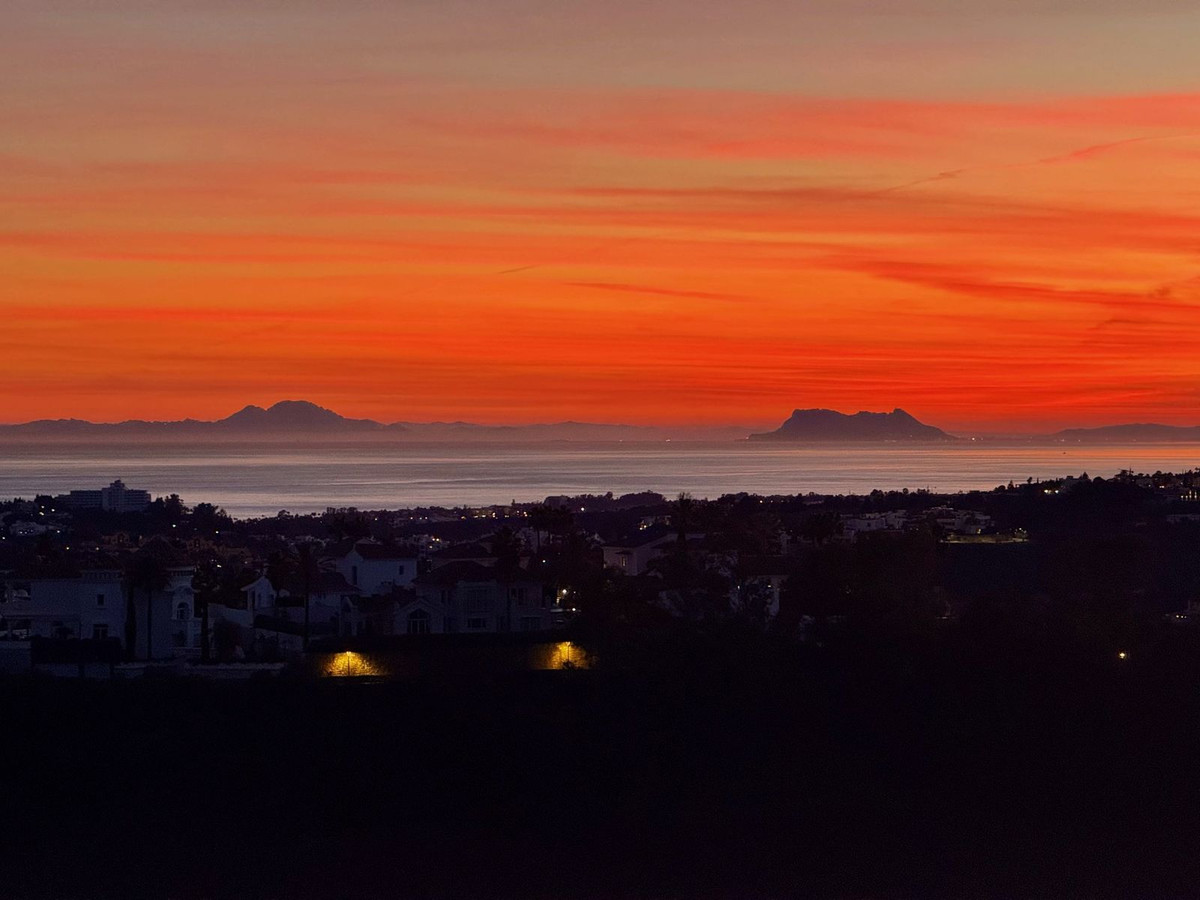 As you approach the entrance, you go up a few steps that lead to the front door. Upon entering, you’ll be greeted by a spacious and light-filled dining and living area, accentuated by floor-to-ceiling windows that create an inviting atmosphere. Step outside to your expansive 22m² covered terrace, which features glass curtains, allowing you to enjoy the stunning panoramic views of the area of Benahavís, the majestic nearby mountains, the iconic Rock of Gibraltar, and the sparkling sea. The beautiful open South-West views provide a sense of comfort all year round to the mind and soul; on clear days, you can even catch a glimpse of the African coast and the Atlas Mountains—truly breathtaking! The sunsets from here are spectacular.