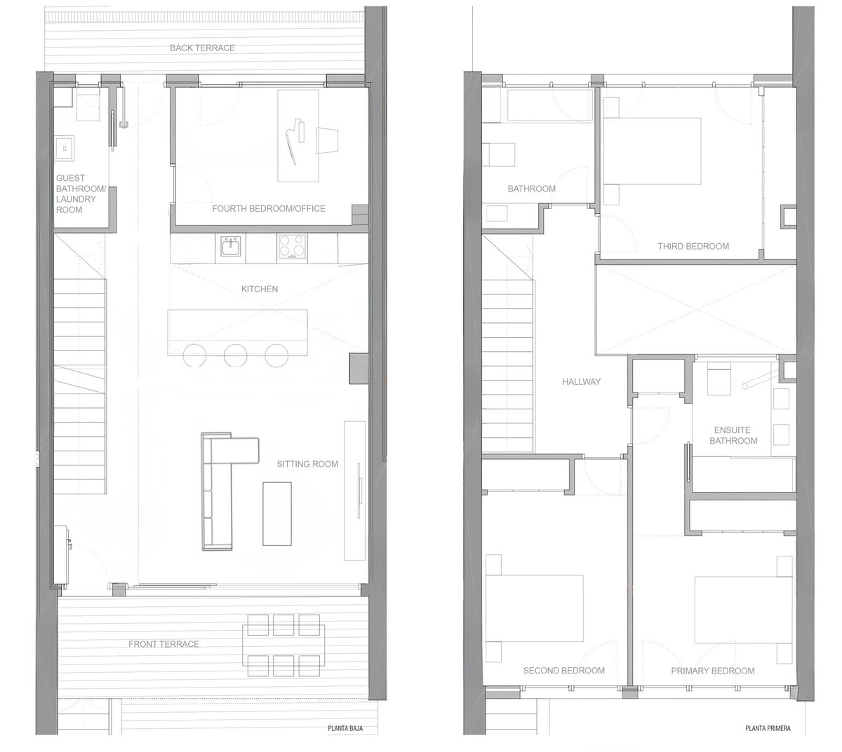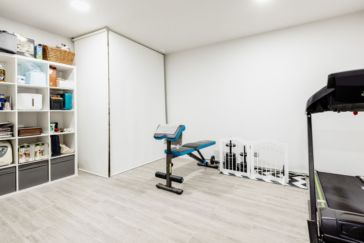The property is distributed across three levels, with bright, open living spaces that make the most of natural light. The main floor features a contemporary kitchen enhanced by a skylight, opening onto a spacious living and dining area with direct access to private terraces. With four bedrooms and three bathrooms, all with natural light, the home is ideal for families, guests, or those seeking additional workspace. A generous multi-purpose basement connects directly to the underground parking, adding versatility and convenience.