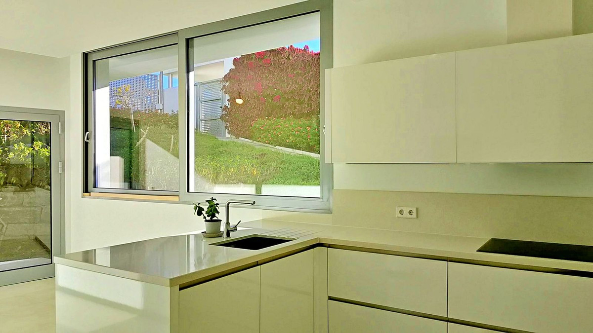 On the first floor, the master suite boasts stunning vistas of the sea and Gibraltar, complemented by a luxurious bathroom featuring a Jacuzzi, shower, and dual vanities. Two additional bedrooms, each with en-suite bathrooms, complete this level.