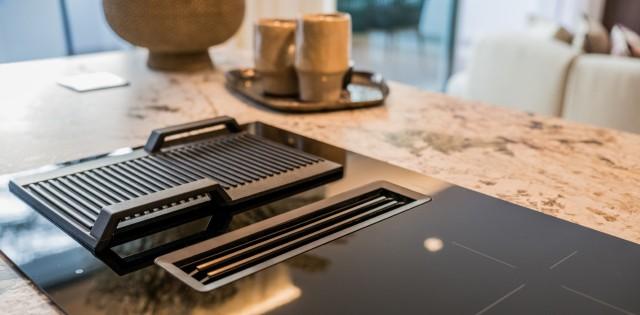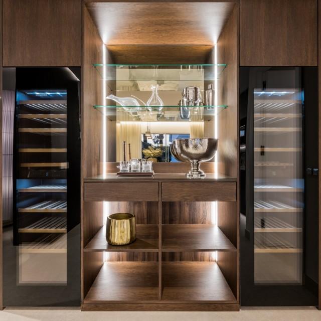 De op maat gemaakte keuken is zowel stijlvol als functioneel en is voorzien van hoogwaardige apparatuur, waaronder een Thermomix, wijnkoelkast en dubbele vaatwasser, naadloos geïntegreerd in strakke keukenkasten. Elk detail is zorgvuldig overwogen om een moeiteloze, moderne woonervaring te bieden.